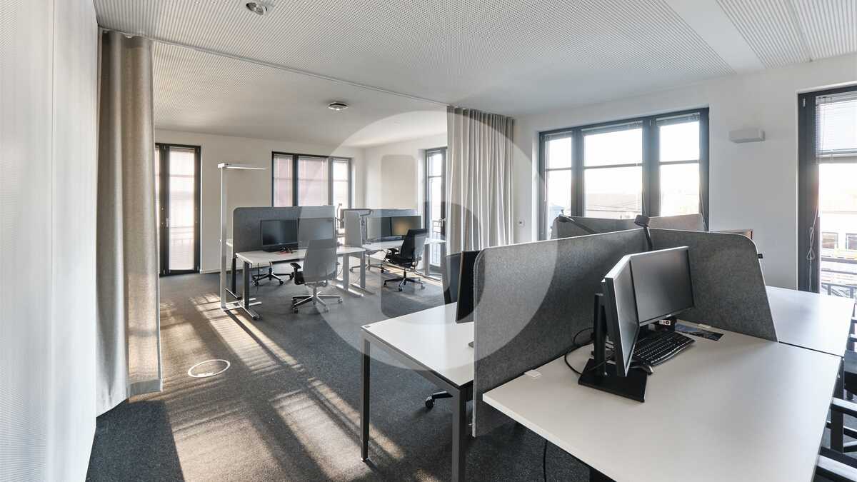 Die Bürofläche in Haus I, im 1. Obergeschoss mit ca. 125 m², verfügt über eine Terrasse von ca. 14 m², die vollständig in die Gesamtfläche eingerechnet wurde